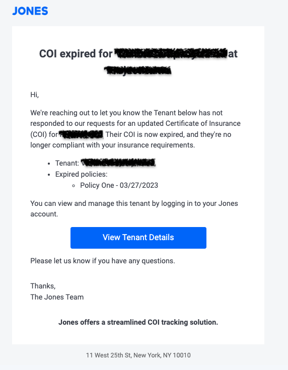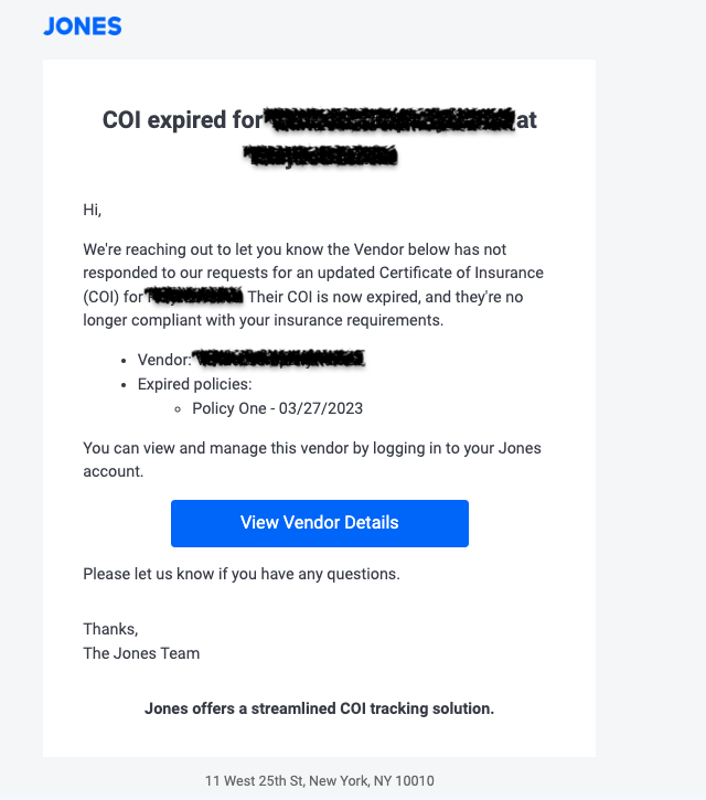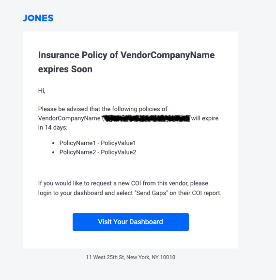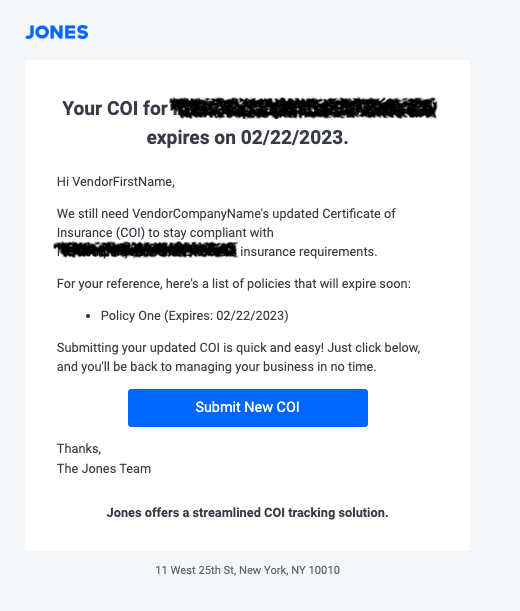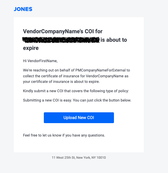 Insurance Policy of [Vendor/Tenant Name] expires Soon | Jones Customer Only (PM) | |