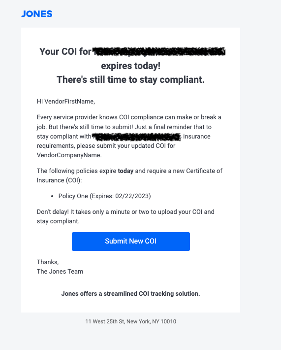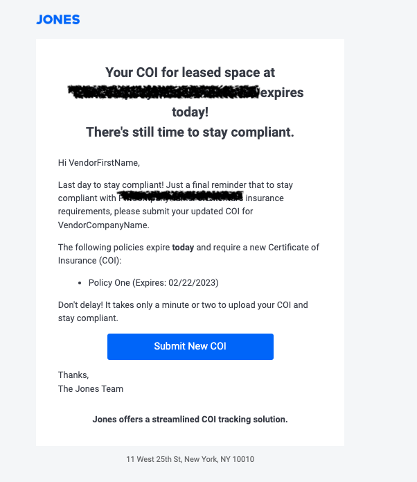On the same day of expiration email for an expired vendor and email for an expired tenant | COI expired for [Vendor/Tenant Name] at [Property/Project Name] - ([project number for construction customers only]) | Jones Customer only (PM) |