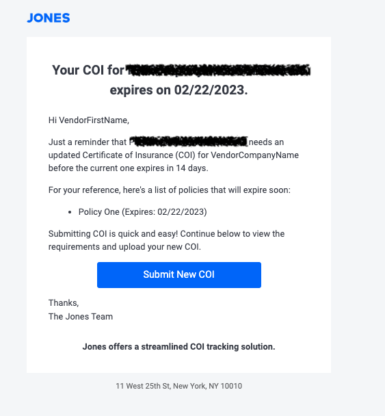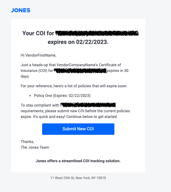 Then once the Jones Customer (PM) requests a new COI from the tenant/vendor, they will receive the below emails. | ||