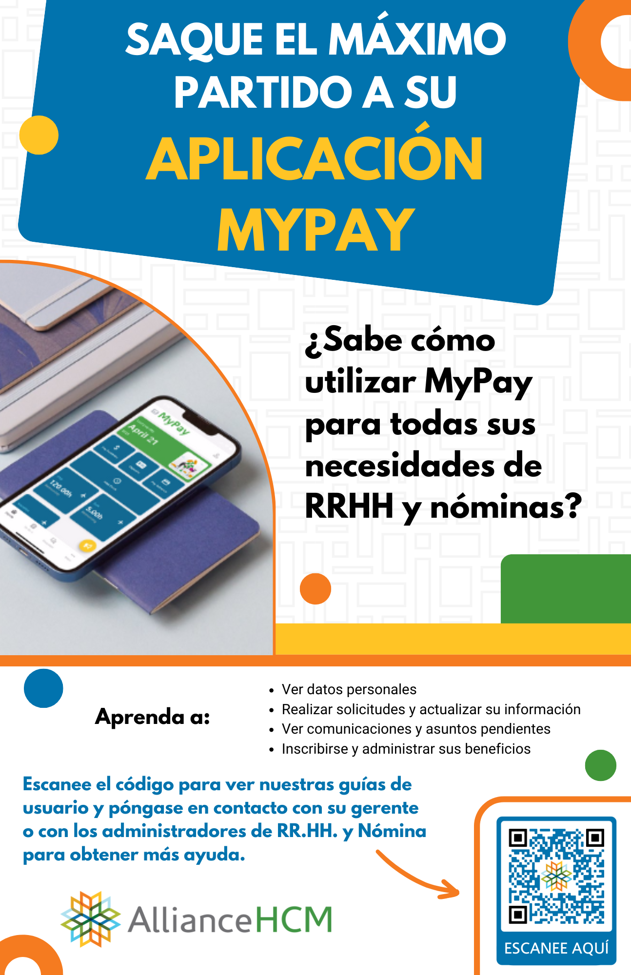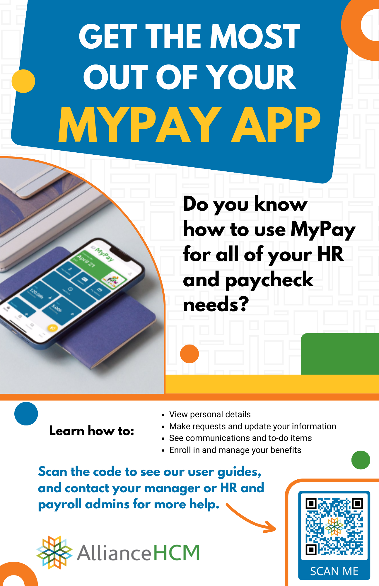 This MyPay poster is for existing AllianceHCM customers to help employees learn how to use the app. The poster includes a brief description of MyPay as well as a QR code so that employees can access employee-centered how-to guides about using the app.