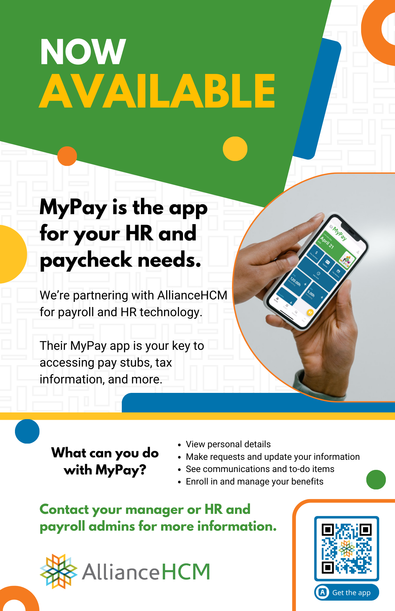 Below you'll find a preview of the poster and multiple file options for downloading the poster. We also have some suggested text to send to your employees informing them of the change to AllianceHCM, which may be useful as a transition letter or email. There is also a dedicated page you can share with employees to promote MyPay. FInd the page here: MyPay is available for your HR and paycheck needs.