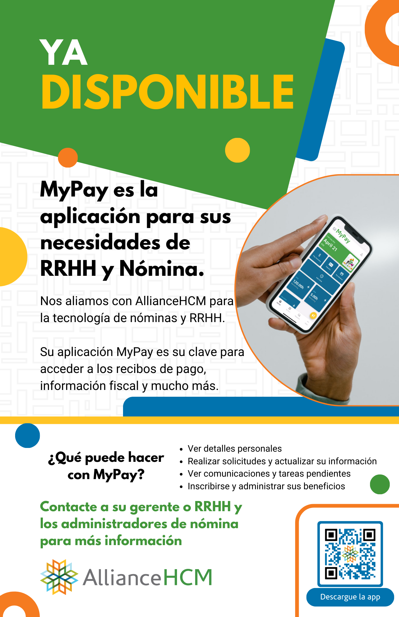 A continuación encontrará una vista previa del cartel y varias opciones de archivo para descargarlo. También tenemos un texto sugerido para informar a sus empleados del cambio a AllianceHCM, que puede ser útil como carta o correo electrónico de transición. También hay una página dedicada que puede compartir con los empleados para promocionar MyPay. Encuentre la página aquí: MyPay está disponible para sus necesidades de RRHH y nóminas.