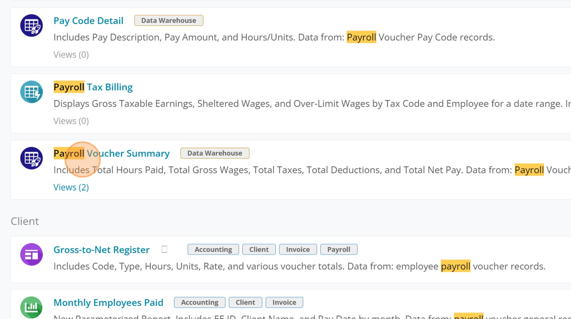 - On the "Search for reports or views" field. Type "Payroll Voucher Summary"